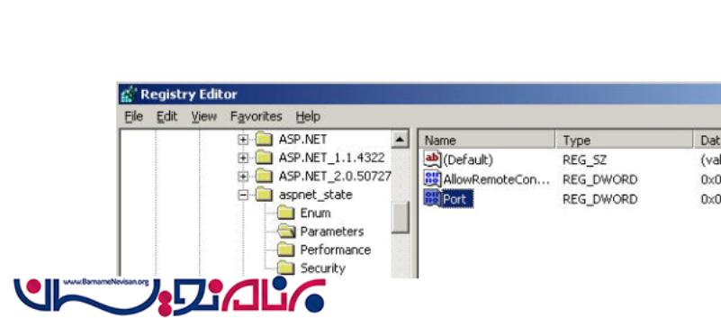 از طریق command prompt , فقط "net start aspnet_state" را وارد نمایید , به صورت پیش فرض این سرویس به درگاه TCP 42424 بررسی می کند .اما ما می توانیم درگاه را از Registry editor تغیر دهیم .مشابه تصویر زیر :