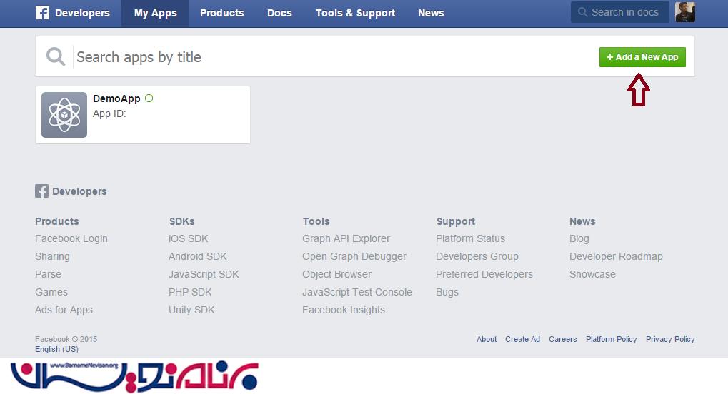 مرحله 1: لینک https://developers.facebook.com/ را باز کنید سپس بر روی My Apps کلیک کرده و Add a new App را بزنید. به همان صورتی که در زیر میبینید.