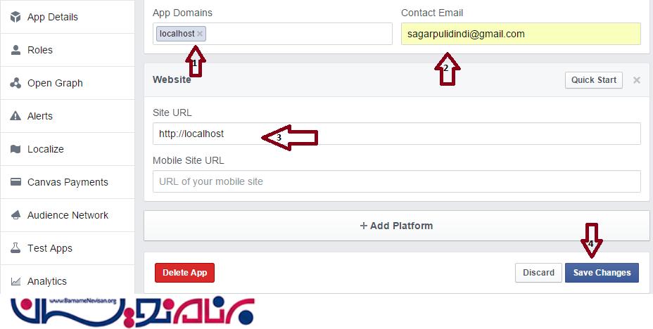 ابتدا روی تنطیمات کلیک کنید و سپس یک platform اضافه کنید ویک وب سایت را انتخاب کنید و ما یک زوج از آیتم های زیر را خواهیم گرفت :