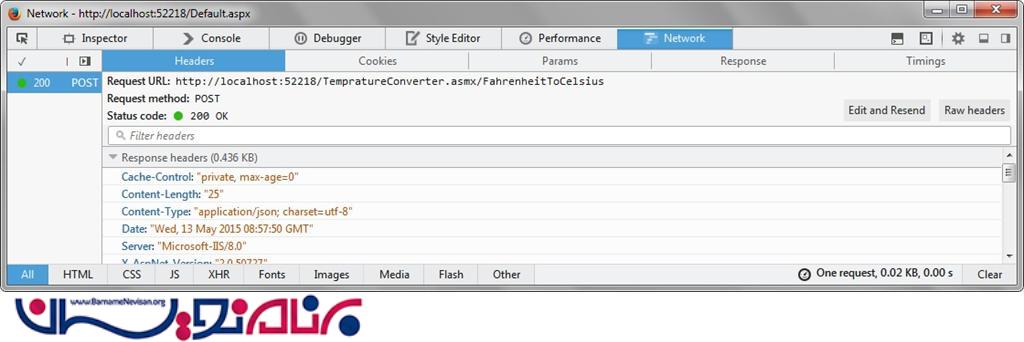 شما به راحتی میتوانید jQuery را خطا یابی(debug) کنید .برای این کار میتوانید از Firebox در مرورگر FireFox استفاده کنید , یا پلاگین Developer Tools در مرورگر Internet Explorer.می توانید پارامترهای ارسال شده به سمت وب سرویس را با استفاده از ajax مشاهده نمایید . در زیر تصویر خطایابی در مرورگر firefox را میتوانید مشاهده نمایید :
