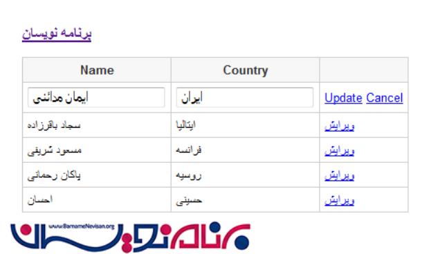 در داخل دستور رویداد Cancel مقادیر موجود در DataTable داخل ViewState ذخیره میشود ، در داخل دستورات مربوط به ویرایش اطلاعات مربوط به DataTable در داخل ViewState ذخیره میشوند ، سپس از طریق RowIndex مشخص میشود که کدام سطر انتخاب شده است .سپس مقدار مربوط به آن DataTable به کنترل TextBox متصل میشود . در آخر مقدار داخل کنترل TextBox در داخل ViewState ذخیره میشود .