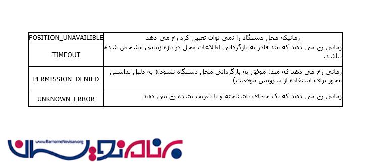 مدیریت خطا : ممکن است شما با پیغام خطایی مبنی بر محدودیت اعمال شده در محل مواجه شوید. این پیغام خطا زمانی رخ می دهد که سخت افزار از منطقه تحت پوشش خارج شده و یا اتصال با شبکه قطع شده باشد. ما بایستی تمامی دلایل ممکن برای مواجهه با خطا در نرم افزار را در نظر بگیریم. ما می توانیم از متد ()getCurrentPosition که دارای پارامتر دوم برای کنترل خطا می باشد استفاده نماییم.