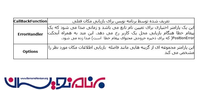 متد getCurrentPosition تابع Callback را، که موقعیت شی ء را به عنوان یک آرگومان می گیرد، صدا زده و این شی ء موقعیت جغرافیایی فعلی را بر اساس مختصات مشخص می نماید.