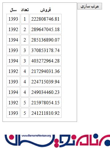 حال زمانی که روی دکمه مرتب سازی کلیک کنیم تابع loadsorted فراخوانی میشود که در این تابع از خصوصیت sort شی json استفاده میکنیم که درون آن تابع دیگری به نام SortMe را فراخوانی میکنیم در تابع SortMe مرتب سازی روی فیلد name که همان سال میباشد انجام میگیرد ادامه تابع loadsorted همانند loadunsortde می باشد برای نمایش اطلاعات مرتب شده یک جول با تگ های html میسازیم سپس یک حلقه روی شی json ی که ساختیم میزنیم و داده های خود را در تگ های td قرار میدهیم: