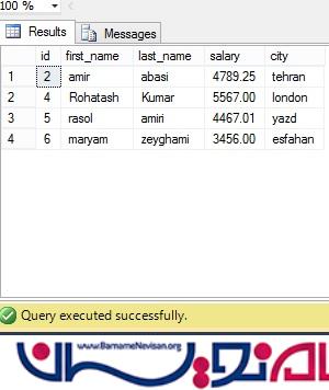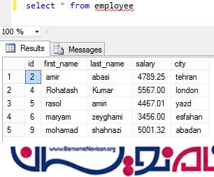 INSERT INTO employee VALUES (2, 'amir', 'abasi',4789.25,'tehran'); GO INSERT INTO employee VALUES (4, 'Rohatash' , 'Kumar', 5567,'london'); GO INSERT INTO employee VALUES (5, 'rasol', 'amiri', 4467.01,'yazd'); go INSERT INTO employee VALUES (6, 'maryam', 'zeyghami', 3456, 'esfahan'); go select * from employee