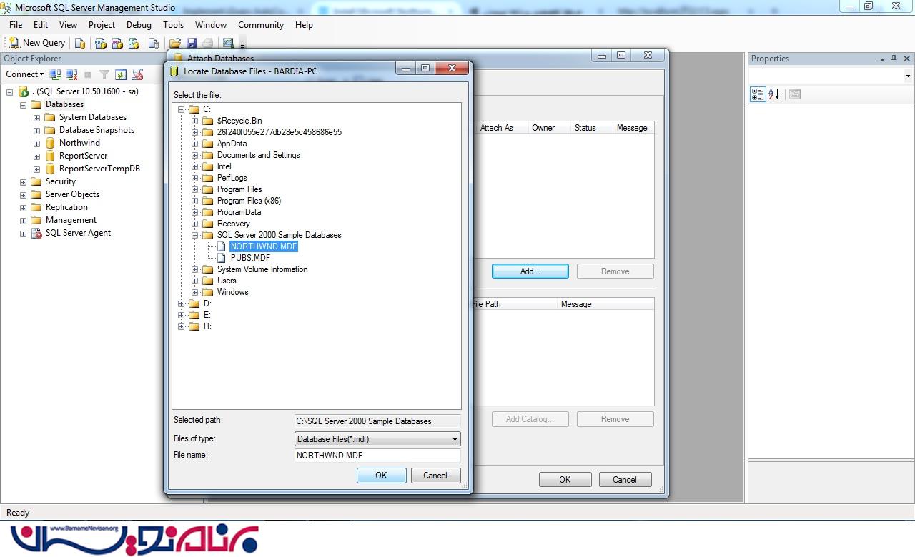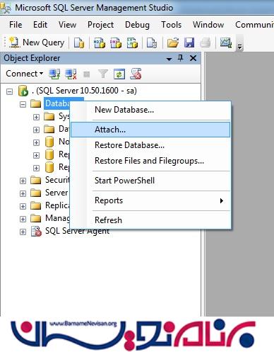 پس از دانلود و نصب فایل اجرایی طبق شکل وارد SQL Server Management Studio شده و با RightClick روی Databases بر روی گزینه Attach کلیک نمایید.