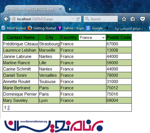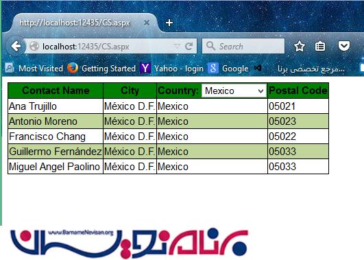 در متد زیر مشاهده می کنیم که GridView با استفاده از DropDownList فیلتر می شود. این DropDownList در سربرگ GridView قرار دارد. که اطلاعات را از پایگاه داده Nortwind و جدول Customer استخراج می کند.