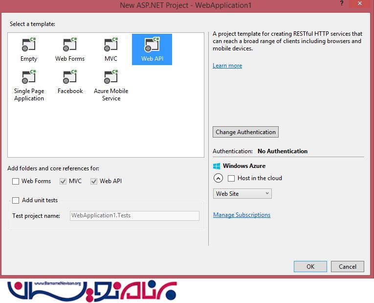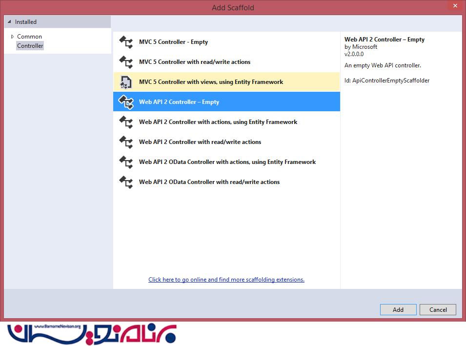 2) یک کنترلر به برنامه اضافه کرده و در صفحه باز شده empty Web API 2 Controller را انتخاب کنید. و در پایان نامی برای این کنترلر انتخاب نمایید.