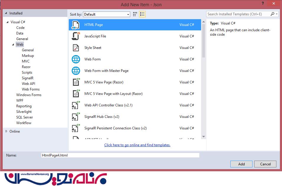 1- Visual Studio را اجرا کنید و یک صفحه HTML به آن اضافه کنید.