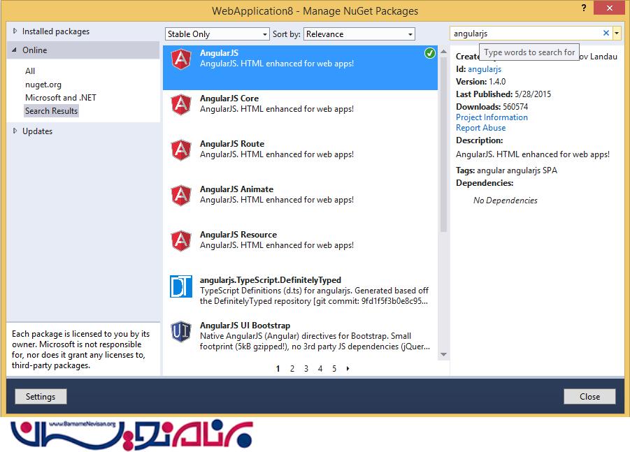 حالا زمان نوشتن کدهای AngularJs قبل از ساخت ویو Index است. به قسمت Manage NuGet package و AnjularJS را نصب می کنیم.