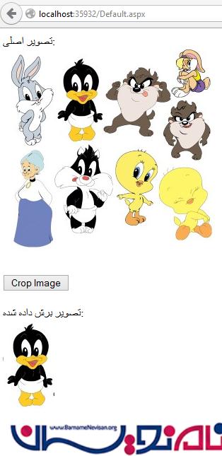 در این مثال می توانیم دو متغیر x,y که ارزش یکسانی دارند را بگیریم ، طول وعرض را برای پنهان کردن فیلد هایی که می توانند در قسمت کد دستورات به منظور برش از تصویر اصلی دسترسی داشته باشد. برای انجام این کار 4 کنترل HiddenField را drag می کنیم (برای گرفتن x,y, وطول ,عرض ) 2 کنترلImage (اولی برای عکس اصلی و دومی برای برش عکس )و یک کنترل Button به منظور برشدرصفحه Default.aspx .با کلیک کردن بررویدکمه Button مامی توانیم عکس را برشدهیم و درپوشه ای به اسم CroppedImages توسط گرافیک API درفضای نام System.Drawing ذخیره کنیم .