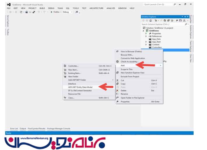 حال در این مرحله برای اضافه کردن بانک اطلاعاتی روی Soultion راست کلیک کرده و در قسمت Add>NewItem> ADO.NET Entity Data Model را برای اتصال به بانک اطلاعاتی انتخاب میکنیم