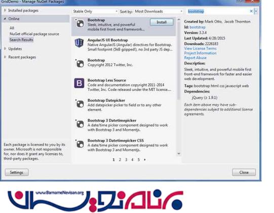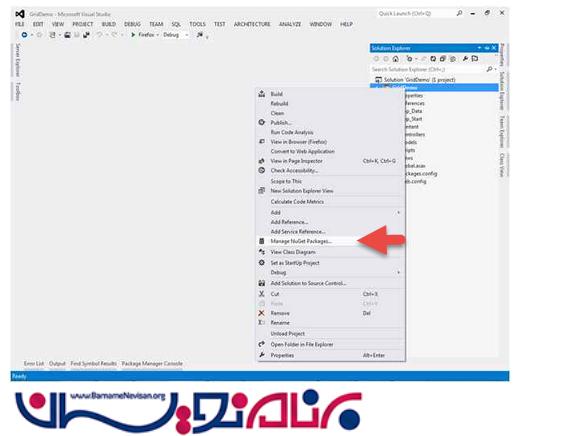 حال برای اضافه کردن Bootstrap و Grid.Mvc روی پروژه راست کلیک کرده و “Manage NuGet Packages" را انتخاب کنید