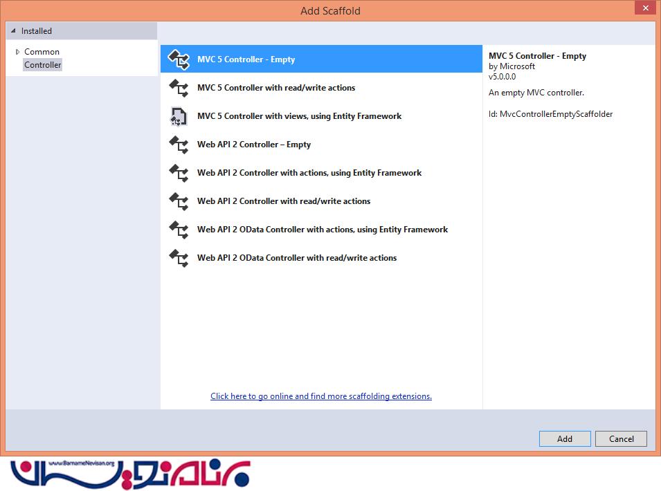 حال روی پروژه راست کلیک کرده و یک کنترلر از نوع Empty به نام Home ایجاد کنید