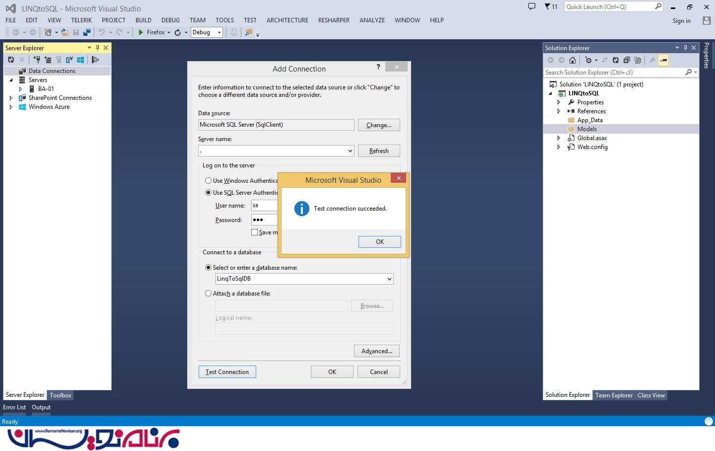 سپس به قسمت Server Explorer رفته، کلیک راست کرده و روی Add Connection کلیک می کنیم. مانند شکل تنظیمات سرور را تنظیم کرده تست گرفته و کانکشن را اضافه می نماییم.