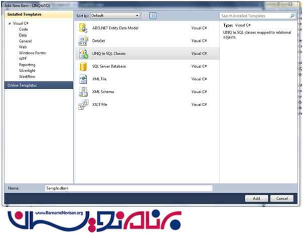در Solution Explorer روی نام پروژه کلیک راست کرده و از قسمت Data یک Linq to SQL Classes با نام Sample می سازیم.