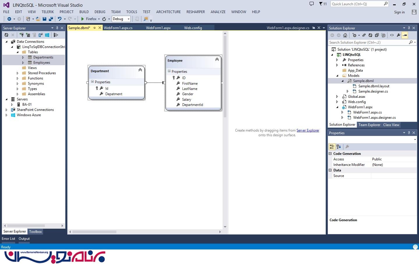 ابتدا بانک اطلاعاتی با نام LinqToSqlDB ساخته و دو جدول در آن با نام های Departments و Employees بسازید.