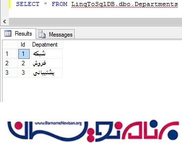 Create table Departments ( Id int primary key identity, depart nvarchar(50), ) Insert into dep values (N'شبکه') Insert into dep values (N'فروش') Insert into dep values (N'پشتیبانی')