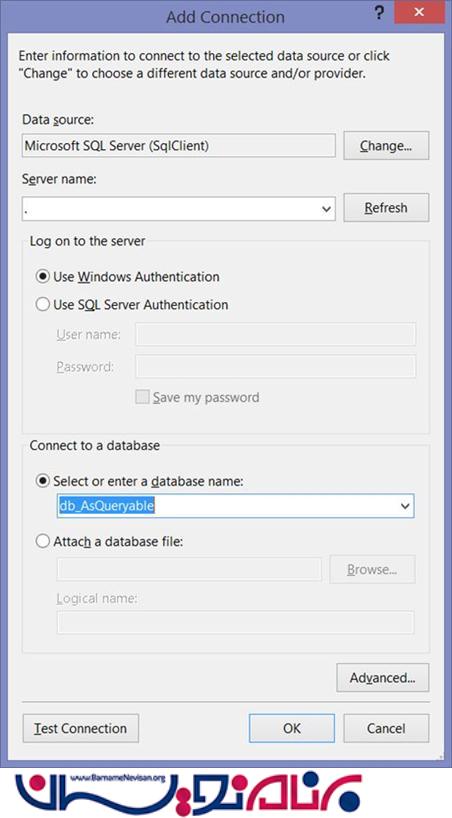 در قسمت server explorer از view و بروی connect to a database کلیک کنید و نام سرور و بانک اطلاعاتی را تعیین کنید .