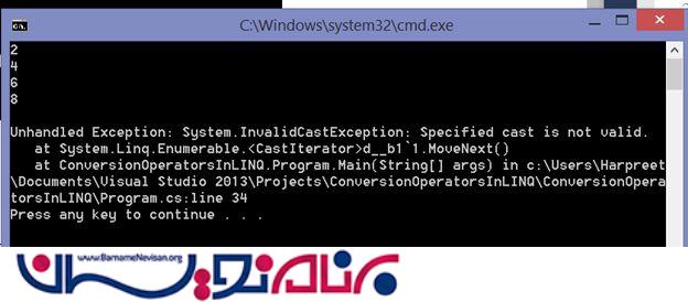 عملگر Cast تلاش دارد تا تمام item ها را به یک نوع دیگر تبدیل کند و آن ها را به یک مجموعه جدید برگرداند. وقتی که در یک item عملگر تبدیل انجام نشد یک درخواست ارسال می شود. متد Cast یا عملگر از اجرای دیر کرد استفاده می کند.