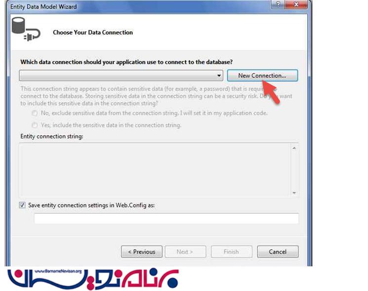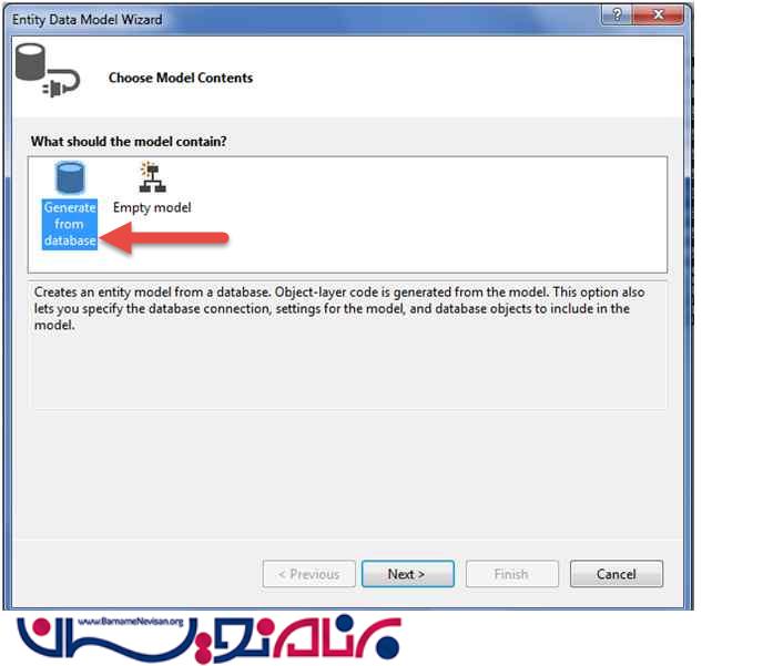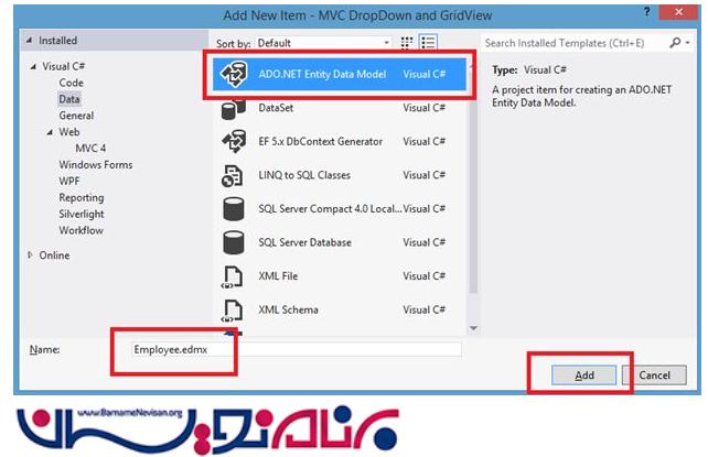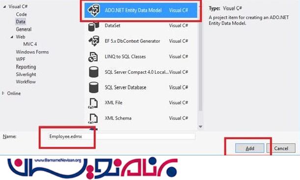 برای اضافه کردن بانک اطلاعاتی به برنامه روی Solution Explorer راست کلیک کرده ودر Add>NewItem>ADo. entity data model را انتخاب میکنیم
