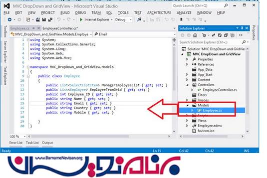 حال روی Modelراست کلیک کرده ویک کلاس به نام Employee.cs ایجاد کنید و به صورت زیر آن را پر کنید