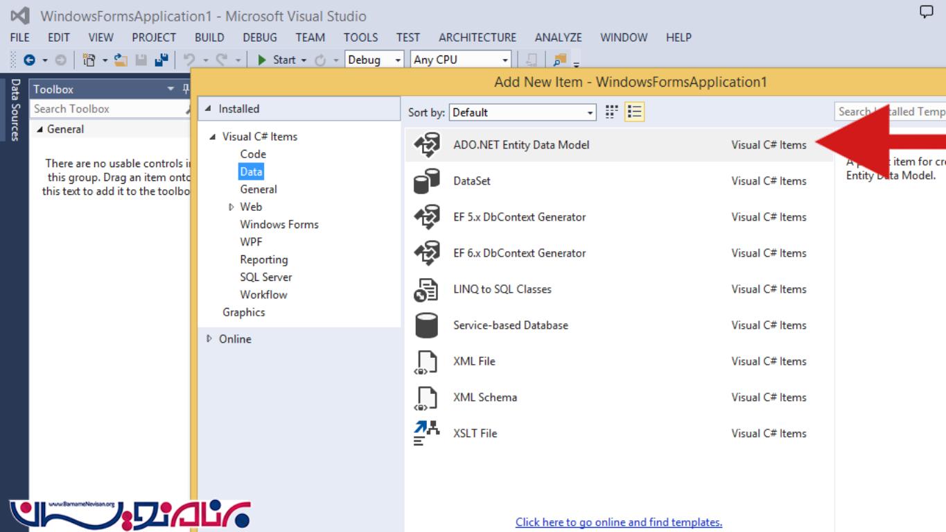 یک مدل از نوع ado.net به پروژه اضافه می کنیم :