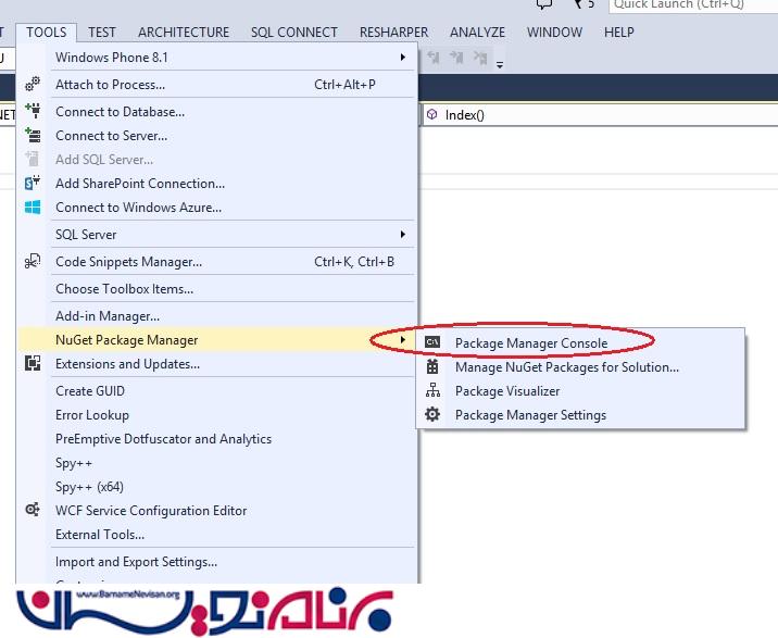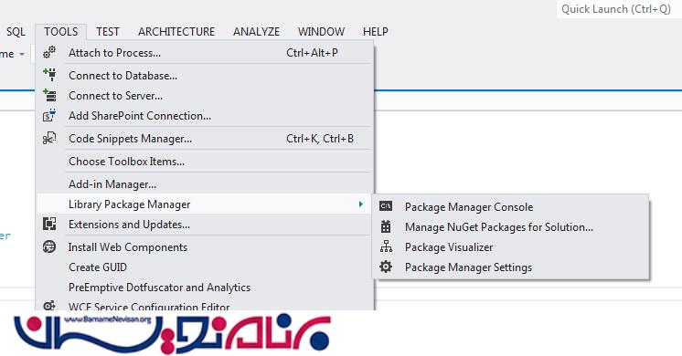 در مرحله بعد اضافه کردن کتابخانه با استفاده از NuGet Log4Net که باید آن را نصب کنیم. برای این کار در منوی Tools و گزینه Library Package Manager را انتخاب کنید.