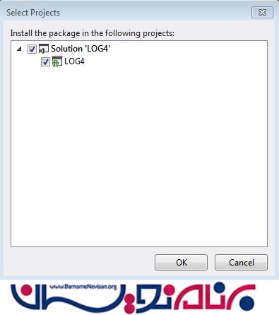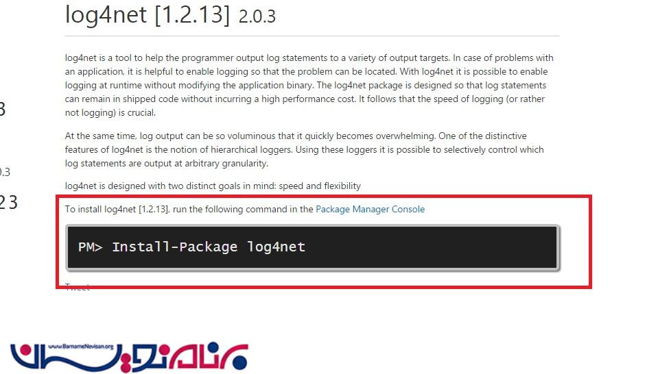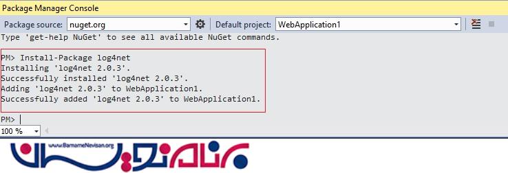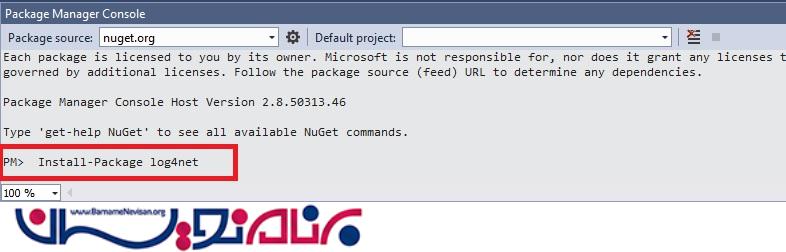 یک راه دیگر برای نصب NuGet، می توان نسخه نصب NuGet Log4Net را از اینجا در قسمت Package Manager Console نصب کرد که همانند شکل زیر مشاهده کنید :