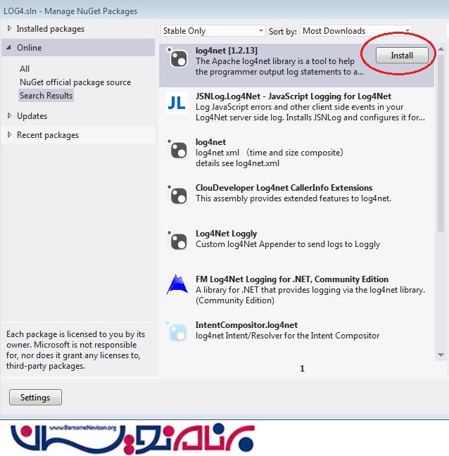 گزینه Manage NuGet Pakage را انتخاب کنید. یک پنجره همانند شکل زیر باز می شود که برای افزودن بسته جدید گزینه Online را انتخاب کنید ودر سمت راست صفحه در نوار جستجو کلمه NuGet موردنظر (Log4Net) وارد کنید و نتیجه را بعد از بارگذاری مشاهده می کنید که بعد از انتخاب آن را نصب کنید.