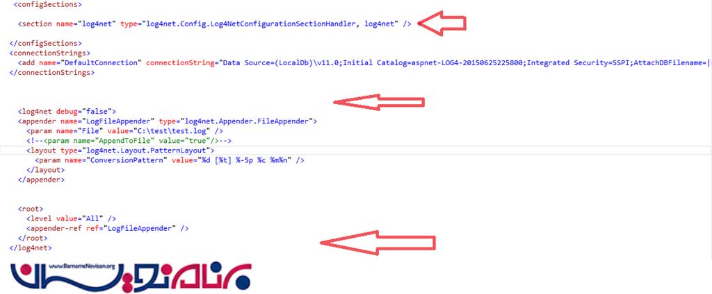 برای این کار ما نیاز به تنظیمات در web.config داریم که یک section با نام Log4Net در <configsections> در web.config ایجاد کنید.