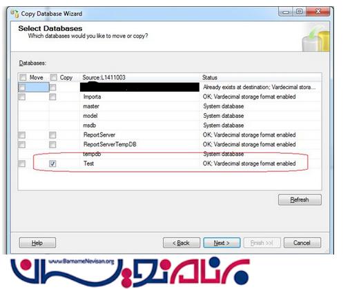 در این مرحله میتوانیم بانک اطلاعاتی ای را که میخواهیم از آن کپی برداریم را انتخاب کنیم همان طور که مشاهده میکنید در این مرحله دو گزینه کپی و حرکت(Move) را مشاهده میکنید