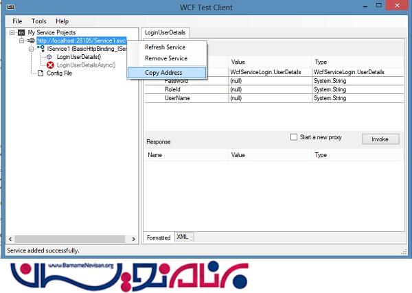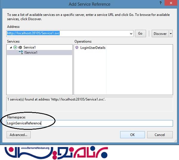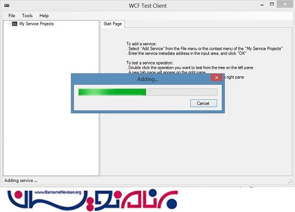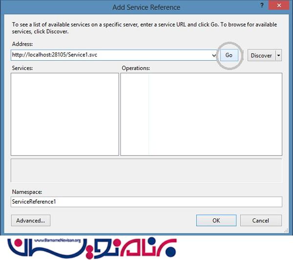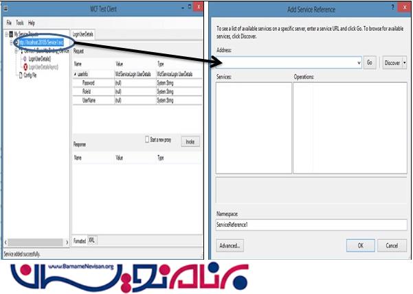 برای تعیین سرویس ، به WCF Test Client بازگردید آدرس را کپی کرده و در Add Service Reference وارد کنید .