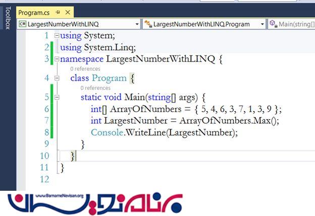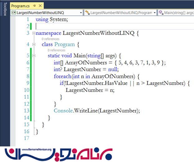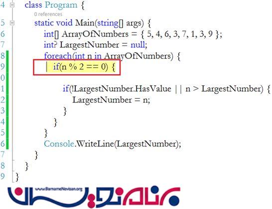 در فایل cs قبلی، ما کدی را نوشتیم که چک می کند آیا مقدار n از مقدار LargestNumber بزرگتراست یا خیر. اگر شرط درست باشد ،مقدار n را به متغیر LargestNumber انتقال میدهد.