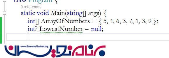 در ویژوال استودیو یک Console application داریم که در آن کلاس برنامه با یک متد اصلی وجود دارد. در متد اصلی یک آرایه از اعداد ایجاد کردیم. در زیر مشاهده کنید: