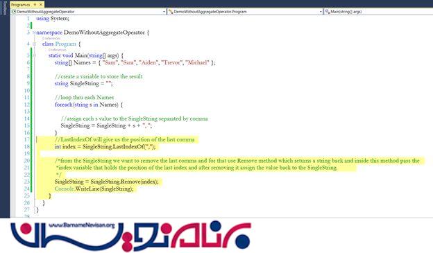 خب ببینیم چطور میشود آن را حذف کرد. برای حذف یک کاما از آخرین رشته ما می توانیم از متد LastIndexOf استفاده کنیم.
