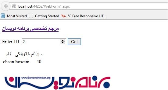 در حال حاضر یک صفحه GetData.aspx ایجاد میشود و تمام کدها در قسمت صفحه aspx. پاک میشود. در صفحه GetData.aspx.cs کد زیر را اضافه کنید: