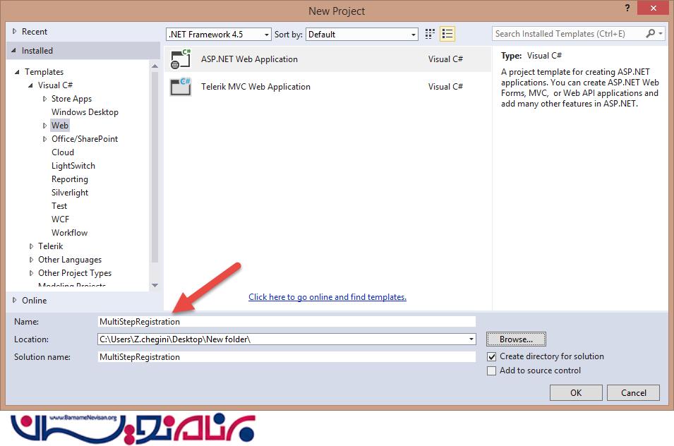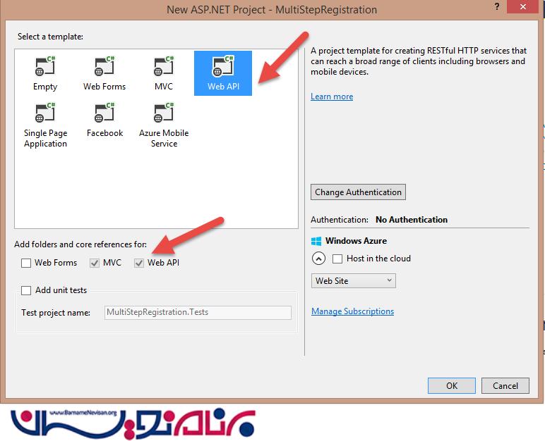 در ابتدای کار یک برنامه کاربردی تحت Web API ایجاد کنید نام آن را MultiStepRegistration بنامید.