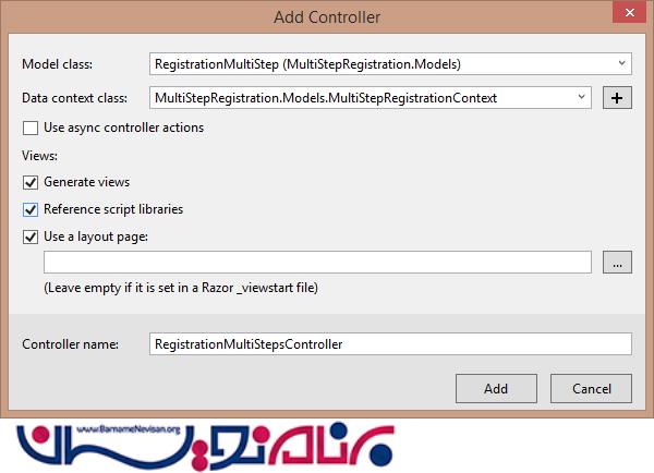روش قبل یک کنترل با تمام امکانات موردنیاز از قبیل متدهای درخواست HTTP GET، POST، PUT و DELETE از روی مدل RegistrationMultiStep برای ما ایجاد میکند. کد را براساس نیازهای برنامه کاربردی خود تعریف نمایید.