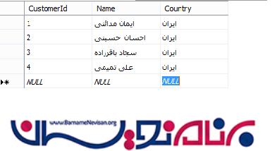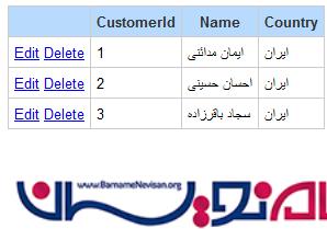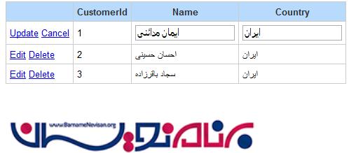 ستون CustomerId که کلید اصلی است از مشخصه DataKey در GridView گرفته می شود در حالیکه فیلدهای Name و Country از ستون های خاص با مراجعه به Textboxها گرفته می شوند .