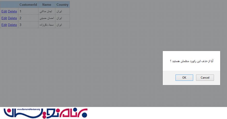 به منظور نمایش پیغام تایید زمانیکه حذف انجام شد، رویداد OnRowDataBound فراخوانی میشود جاییکه دکمه حذف اولین بار کلیک می شود سپس باید تایید جاوا اسکریپت به مدیریت رویداد Click در سمت کاربر متصل شویم .
