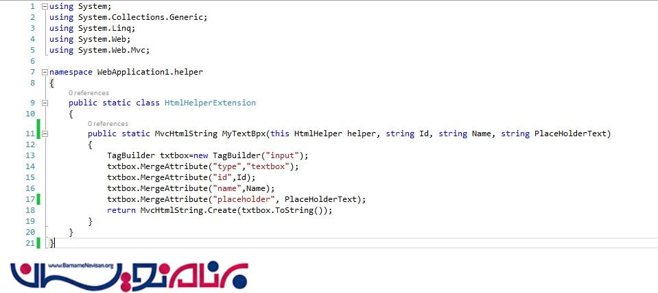 مرحله سوم : برای ایجاد متد Extension ما نیاز به ساخت یک کلاس پویا داریم که فضای نام System.Web.Mvc برای دسترسی به کلاس htmlhelper می باشد.