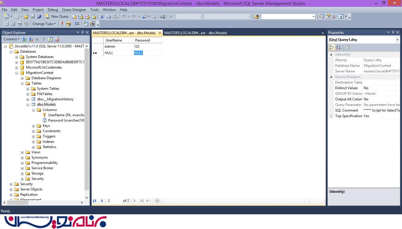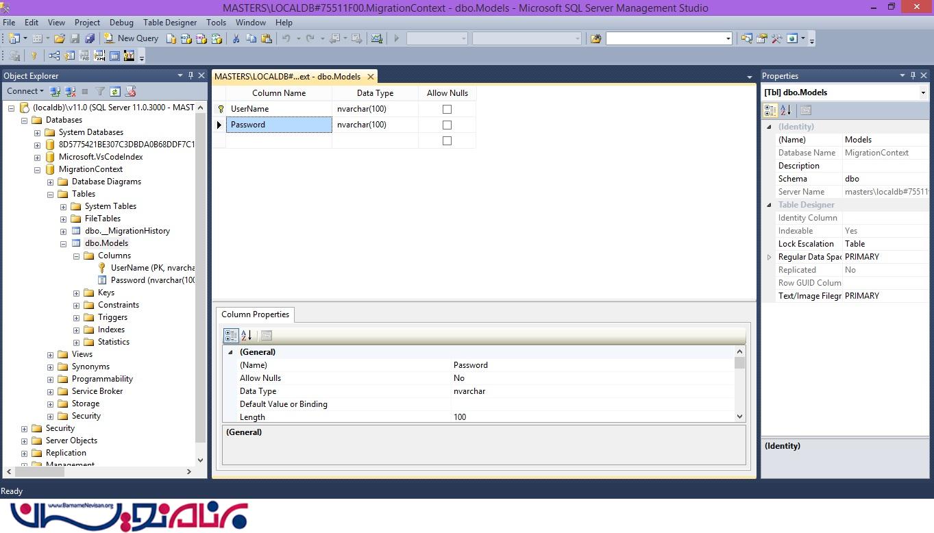 در ابتدا مدل ما دارای دو ستون UserName و Password است.کنترلر را از نوع EntityFramework ایجاد میکنیم و تیک Gnerate را میزنیم و سپس پروژه اجرا کرده تا دیتابیس در (LocalDB) ایجاد شده و بتوانیم جدول های ایجاد شده را مشاهده کنیم.