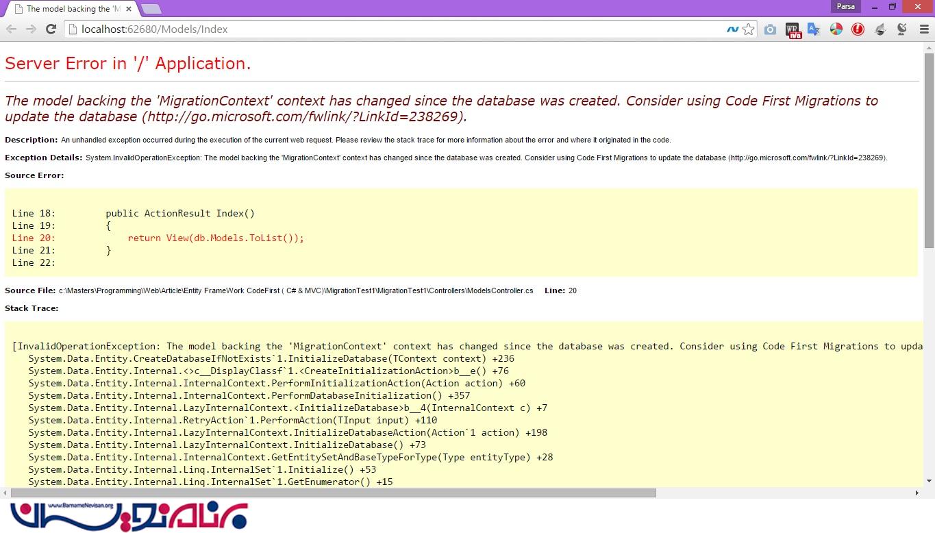هنگامی که تغییرات را ایجاد کردیم و مدل را تکمیل کردیم ، زمانی که اجرا میکنیم با خطای زیر مواجه می شویم.