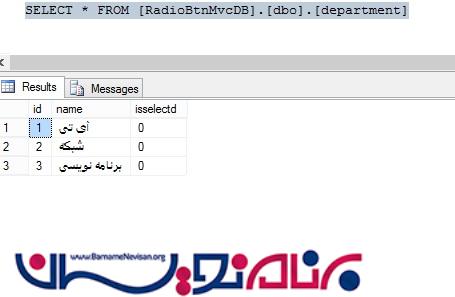 ابتدا مانند شکل زیر یک بانک اطلاعاتی با نام RadioBtnMvcDB ساخته و یک جدول در آن با نام department ایجاد نمایید.