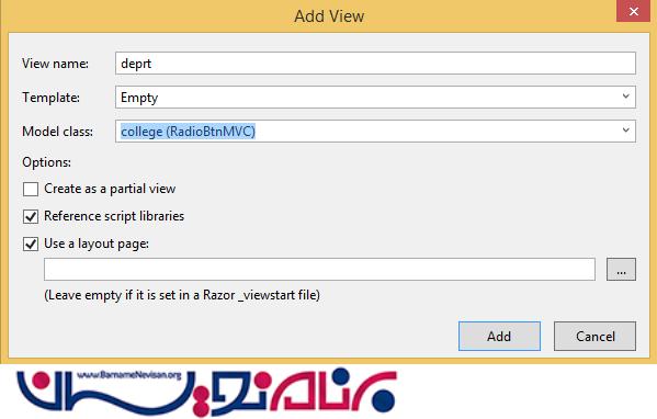روی متد ActionResult راست کلیک کرده و Add View را انتخاب می کنیم. پس از کلیک dialog box باز شده که ViewName به صورت پیش فرض deprt می باشد. مدل را انتخاب کرده و ok می کنیم.