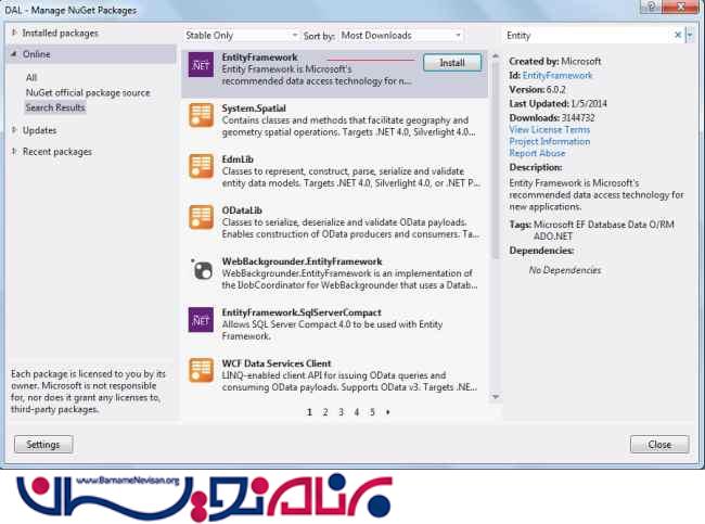 Entity را تایپ کرده و جستجو می کنیم و پس از پیدا کردن آن روی Install کلیک می نماییم تا Reference های آن به پروژه اضافه شوند.