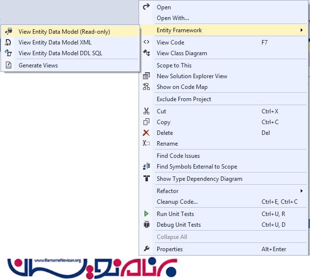حالا قابلیت جدیدی به ویژوال استادیو شما اضافه شده است. اگر روی Context خود کلیک راست نمایید می بینید که مطابق شکل تب جدیدی با عنوان Entity Framework اضافه شده است.