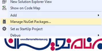 سپس روی نام پروژه کلیک راست کرده و بر روی گزینه Manage Nuget Packages کلیک می کنیم.