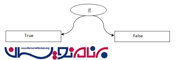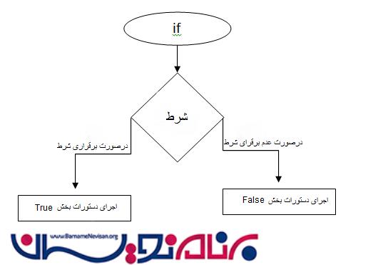 این شکل نحوه اجرای عبارت شرطی را نشان می دهد. در صورت درست بودن شرط، دستوراتی که در بخش True می باشند، اجرا خواهند شد. در غیراینصورت دستورات بخش False اجرا می شوند.